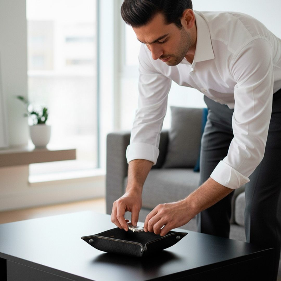 Diseñado para quienes valoran el detalle, el Vassoio Holder es más que una bandeja: es el espacio donde tus esenciales diarios encuentran su lugar. Fabricado en cuero de alta calidad con acabados sobrios y esquinas abotonadas, es perfecto para organizar tu reloj, joyas, llaves, tarjeteros o accesorios.